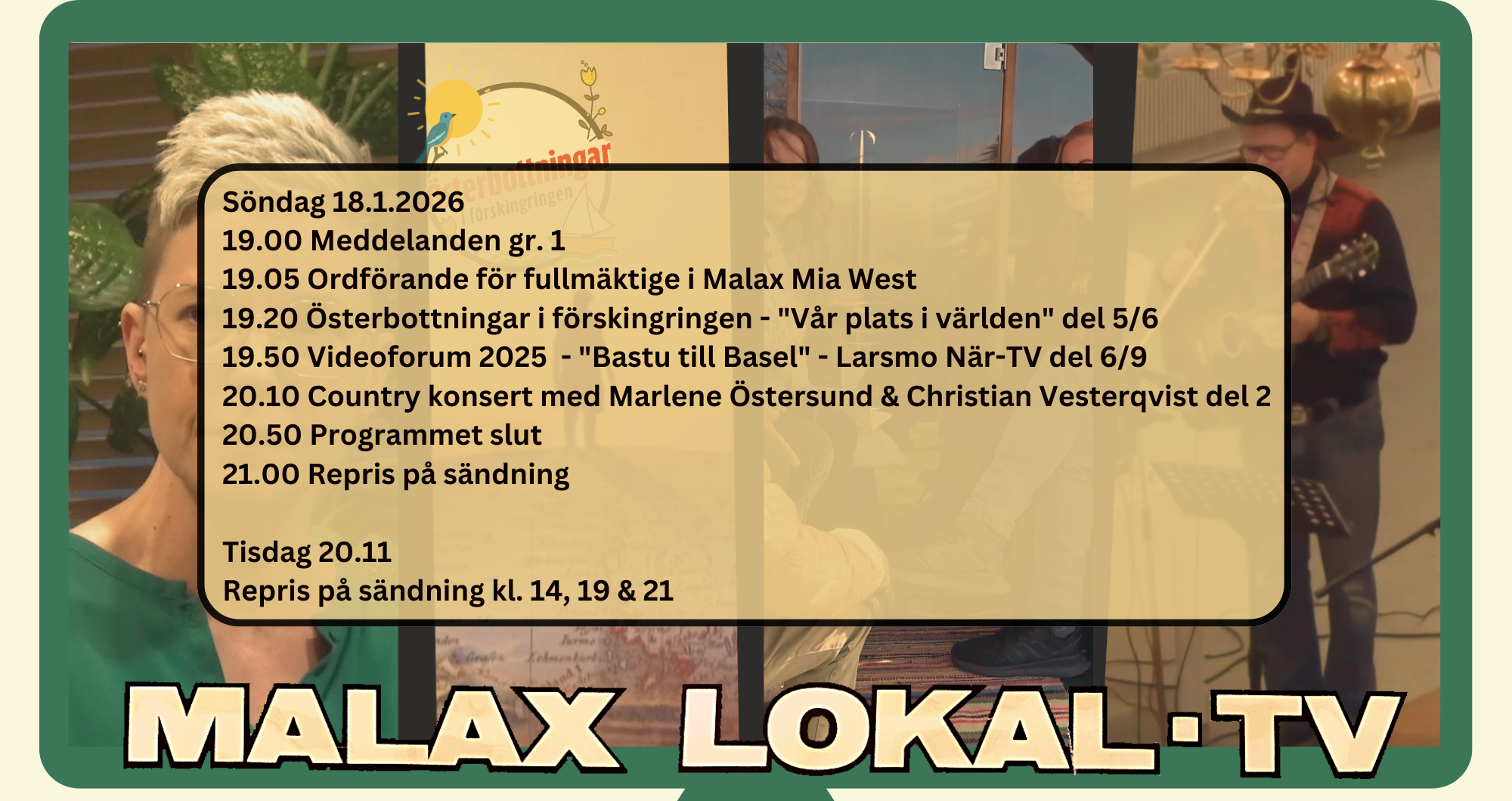 Läs merHej alla tittare! Vi har ännu många program från förra året som ni kan se framemot och hålla utkik efter när dom kommer att sändas. Bland dessa finns Vikingarna i Åminne 2019, Rönnholm sommarfest, Ungdomsgalan, veterantraktor utställningen och Allsång vid Knösgården. Följ med i annonsering så ni inte missa nåt av dessa program.